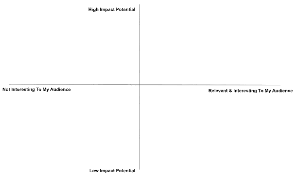 What I love about this diagram is that it forces you to think about the two things that actually matter: how interesting + relevant something is to your audience, and how much potential impact a given topic/article can have on your business (defined as traffic volume * conversion rate * expected value of a conversion) if that content is distributed in a systematic + comprehensive manner to your audience.