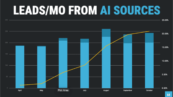 This shows the number of leads from AI sources (Gemini, ChatGPT) in dark blue, with the percentage of total leads (the full bar) in yellow. Over the last 7 months, the percentage of leads coming from AI sources has increased nearly 10x – from just over 2% to just under 20%.