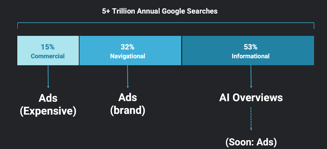 Here is why this is a big deal: Historically, Google Ads monetized “commercial intent” (e.g., buy nike shoes) and “navigational intent” (e.g., Nike shoes). AIOs allow Google to monetize “informational intent” (e.g., best running shoes for flat feet). The problem? The vast majority of queries are informational! Monetizing AI overviews unlocks (potentially) trillions more search ad units every single year – that’s both a lot of potential revenue for Google (yes, I’m still long Google) and a lot of potential revenue for brands that can navigate the opportunity: