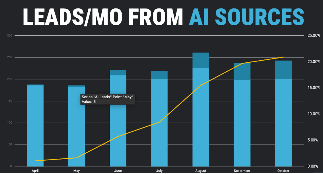 The chart below shows the total volume of leads for a brand over 7 months in 2025 (I was lazy and wanted to wait until January to update this, so we have all 2025 data in) – the light blue is non-AI leads; the dark blue is leads from AI sources. The yellow line shows the share of AI leads. This is not a particularly large site/business (it’s a B2C lead gen business that’s averaged ~150-200 leads/mo) – but you can see two things: (1) the share of AI leads has exploded – from <5% to >20% in just 7 months and (2) many of those leads are incremental.