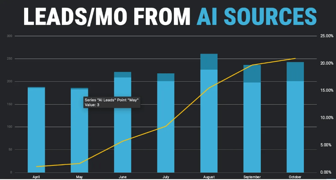 I shared data in Issue #148 showing LLM-sourced leads for a B2C business growing from less than 5% to over 20% of total leads in 7 months. These aren’t “visibility impressions.” These aren’t “brand mentions in an AI answer.” These are real leads that convert into real customers who spend real money. What’s equally interesting? Those leads increased while the total number of leads from other sources also trended up. Put another way: AI leads were not previously organic leads; they were net-new. Incremental.