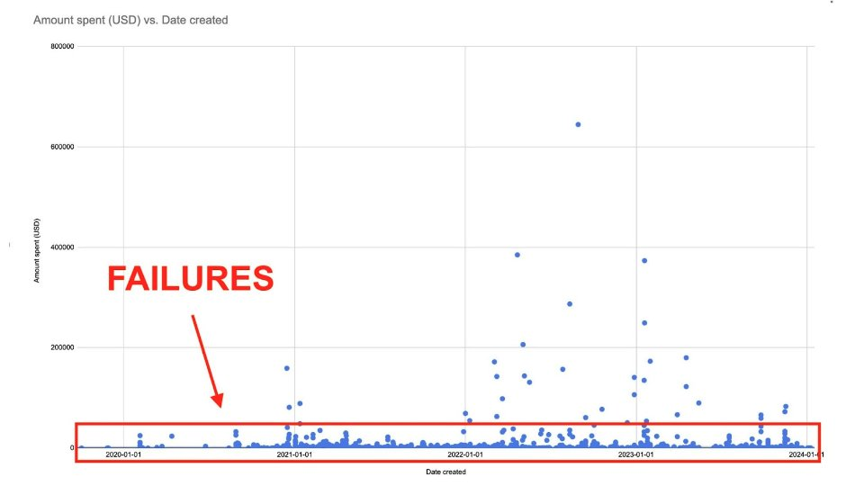 The same is true in advertising. The vast majority of ads fail. Across our accounts, we consistently see that a minuscule fraction of ads – 5%, 10% – account for 50%+ of the attributed revenue/conversion value (and of the spend).