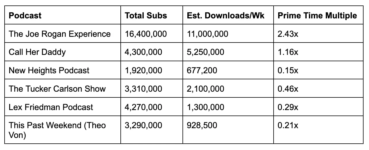 And yes, while Nielsen + Podcasts tend to measure different things (viewership is estimated viewers during the average minute; downloads is just total downloads vs. downloaded + complete listens), let’s not lose the upshot for the sake of the details: a single episode of Joe Rogan or Call Her Daddy likely has a greater impact than a prime-time appearance on every major cable network, combined.